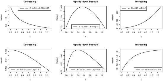 Figure 2 presents the identified shapes for the hrf of the NHLx distribution. From Figure 2, we see that the hrf can be increasing, decreasing, or upside-down bathtub-shaped, with flexible convex–concave properties. In particular, these curve modulations are possible thanks to the variation of the new additional parameters a. We are far beyond the curve possibilities of the hrf of the EXL distribution, which is only increasing according to [14]. Thus, from one perspective, the NHLx distribution adds a new shape parameter a to the EXL distribution in a thorough fashion, considerably improving its modeling properties.