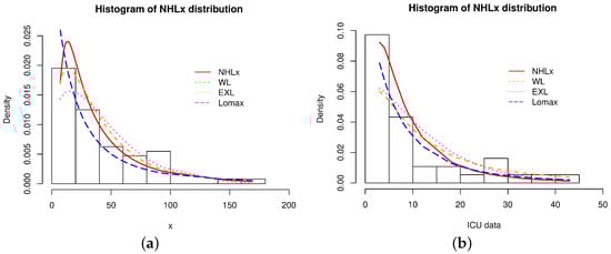 Based on the MLEs, we define the estimated pdf of the NHLx distribution by . Conceptually, the curve of this estimated function must be close to the shape of the histogram of the data, among other visual criteria.