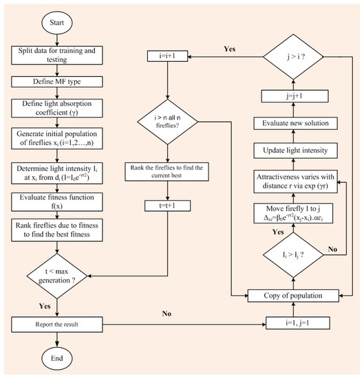 where r is the distance between fireflies, is light intensity, is attractiveness at r = 0 distance, and is the light absorption coefficient. β and α are the attraction and movement co-efficient. α, β, and are required to be adjusted by trial and error, in order to integrate the ANFIS model with the FFA [14].