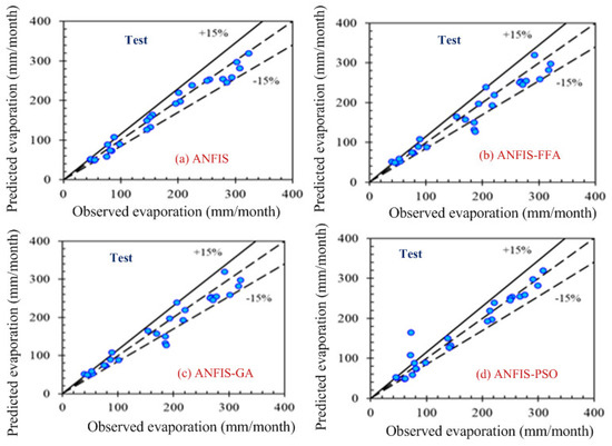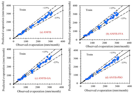 According to the graphs, both data sets lie between −15% to +15% of a perfect line. Graphical presentation also demonstrates that the data set are well-trained. According to the analysis, all the models are suitable for the evaporation estimation. However, the pattern for Figure 6a ANFIS (first combination) and Figure 7a ANFIS (second combination) were the best fits, and the pattern for Figure 6b ANFIS–FFA (first combination) and Figure 7b ANFIS–FFA (second combination) show less fitness among the four models. The figures for ANFIS–PSO and ANFIS–GA, for both combinations, were close to each other. Additionally, a few accuracy tests were performed to obtain a better understanding for both training and testing. Few statistical indices tests have been performed and summarized in Table 2, Table 3, Table 4, Table 5 and Table 6.