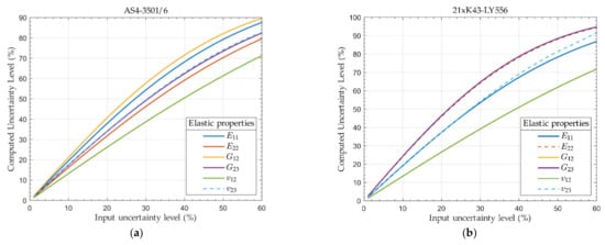 The level of computed uncertainty for both composite materials is depicted in Figure 1, when all input parameters varied between 1% and 60% of their nominal values. For an input level of 60%, the output level ranges from 71.2% to 89.6% for the AS4-3501/6 material and 71.8% to 94.7% for the 21xK43-LY556 material. We observe from Figure 1b that the output uncertainty of G12 coincides with G23 since they share the same mathematical expression and Gf12 = Gf23.