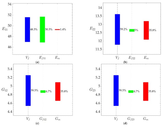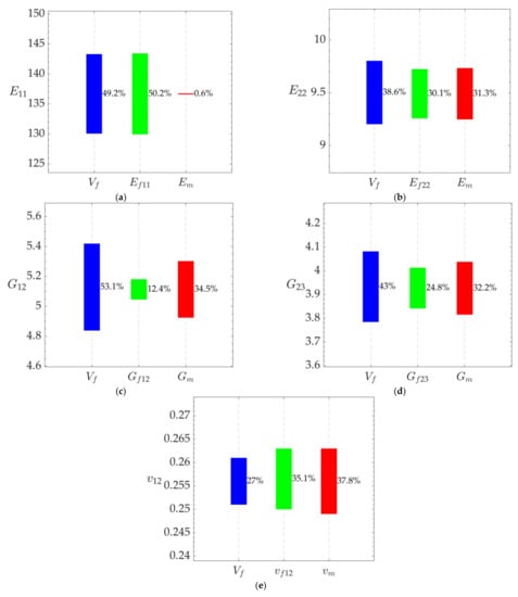 Although, qualitatively, the contribution is the one expected from the mechanic’s viewpoint, it is very interesting to quantify it. For the AS4/3501-6 material, to the uncertainty of E11, Ef11 contributes by 50.2% and Vf by 49.2%, with Em by the minor 0.6%. To the uncertainty of E22, Vf contributes by 38.6%; Ef22 by 30.1%; and Em by 31.3%. To the uncertainty of G12, Vf contributes by 53.1%; Gf12 by 12.4%; and Gm by 34.5%. To the uncertainty of G23, Vf contributes by 43%; Gf23 by 24.8%; and Gm by 32.2%. To the uncertainty of ν12, Vf contributes by 27%, νf12 by 35.1%; and νm by 37.8%. To the uncertainty of νf23, Vf contributes by 36.4%; νm by 36.4%; νf23 by 16.9%; and νf12, Em, Ef11, and Ef22 by 2.6%. Similar values were obtained for the 21xK43-LY556 material (Figure 3). Similarly, for the strengths, to the uncertainty of F1t, Vf contributes by 29.1%; Fft by 50.2%; and Fmt by 0.7%; and to the uncertainty of F1c, Vm contributes by 49.9% and Vm by 50.1.%. Similar values have been obtained for the 21xK43-LY556 material (Figure 3).