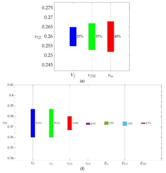 The effect of input parameters on the range of (a) the E11, (b) the E22, (c) the G12, (d) the G23, (e) the ν12, and (f) the ν23 for the 21xK43-LY556 composite ply. The main parameter varied within ±5% of its nominal value while the other parameters were kept equal to the nominal value.