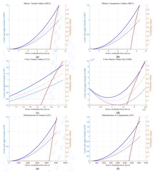 Figure 4 and Figure 5 plot the variation in the lower and upper bounds and the nominal value of the six failure criteria (Equations (A13), (A14), (A15), (A17), (A18), (A19)) as well as the probability of failure (Equation (6)) of each failure mode with regards to the stress multiplication factor for the two UD composite plies. Note that the fiber compressive failure mode has been excluded since it is not a feasible failure mode for a ply under tension; σ1 is always positive. The very large values of the stress multiplication factor appear for delamination because, for the specific loading (uniaxial tension), delamination is very difficult to develop; it is almost not feasible. As long as the upper bound of the failure criteria remains below 1.0, the probability of failure is 0. When the upper bound exceeds 1.0, the probability of failure starts to increase linearly at a high slope.