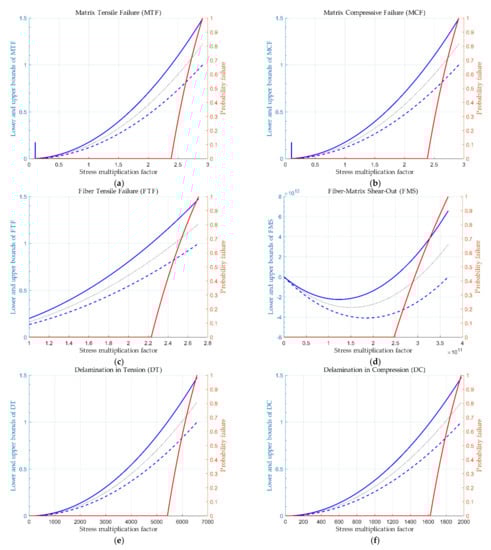 This section exploits the computed bounds of the properties in connection with the Hashin-type failure criteria [4]. We can guarantee that, although there is uncertainty when the upper bound of a criterion is less than 1, there is no failure (100% safe). In different cases, we can quantify the failure probability. The same procedure can be applied to any other failure criteria, such as the Hoffman, Tsai-Wu, and Tsai-Hill criteria [16].