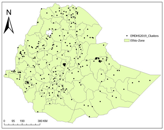 The EMDHS 2019 was a nationwide survey that included a nationally representative sample of 9150 randomly selected households. In the selected households, all children under the age of five were eligible for measurements of weight and height. The survey was designed to generate reliable estimates of important indicators for urban and rural areas, for each of the regions, and at the national level in Ethiopia. Figure 1 depicts the clusters included in the 2019 EMDHS.