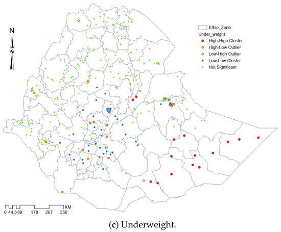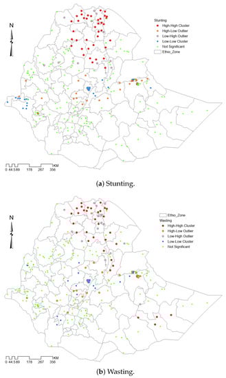 In general, we can see the spatial structure in the undernutrition estimates, namely in that two areas that are neighbors have more similar risks than two areas that are far apart. Specifically, spatial pattern analysis showed that there is spatial effect for being underweight, wasting, and stunting among children. The Global Moran’s I test results are given in Table 2, showing the existence of significant spatial autocorrelation. Similarly, Anselin local Moran’s I analysis and pattern (cluster and hotspot) analysis (Figure 3) showed the existence of significant clusters of a high as well as low prevalence of malnutrition. Hence, taking the spatial random effect in modeling evidently will have a great role. Therefore, the spatial random effect was taken into account in the small area estimation.