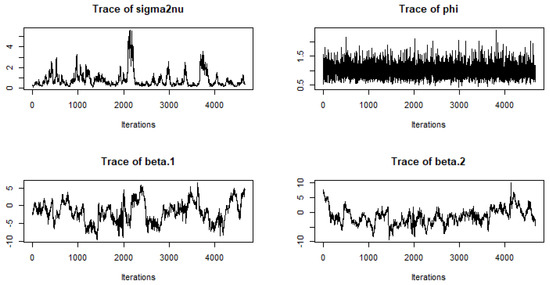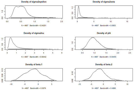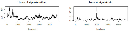A total of 20,000 MCMC samples were generated from the posterior distribution. Considering a burnin period of 6000 and thinning for every third, 4667 samples were retained for the final process. The convergence and independence of the samples were confirmed from the trace plots (Figure 4), density plots (Figure 5), autocorrelation plots (Figure 6), and Geweke’s test of convergence (Table 3). All these show that there is no evidence of assumption violations; that is, the samples were a realisation of stationary distribution.