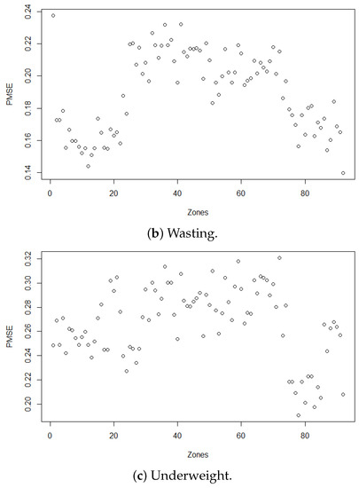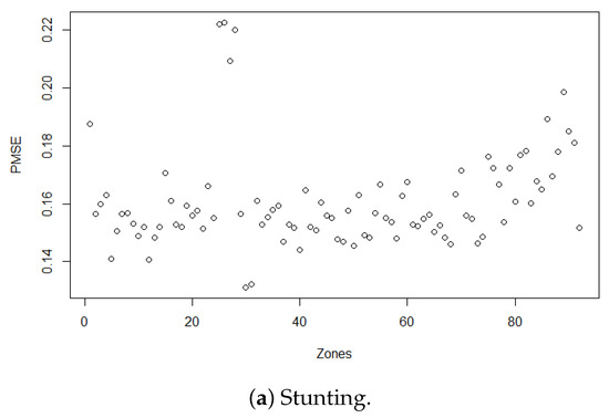 Benchmarking is important in that the model-based estimators do not benchmark against the direct survey estimate for large areas [30]. To avoid possible overshrinkage and model misspecification, the model-based HB estimates p ^ i were benchmarked so that the benchmarked HB (BHB) estimates added up to the direct large area (regional level in this study case) estimate. The posterior mean squared error (PMSE) was used to measure the variability of the BHB estimators. The PMSE is the sum of a bias correction term and the posterior variance.
