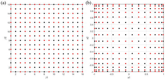The candidate points of the arbitrary orthogonal polynomial are Gauss integration points, which are denser along the boundary. For the sequential sampling scheme, the candidate points should satisfy the rule of being uniformly distributed. In other words, a candidate set of a sequential sampling scheme is symmetrical [57]. To overcome this limitation, a space will be introduced to change the candidate points to an equal-weighted form. In space, the coordinates of the integration points in set will be indicated by the component , where is the number of integration points for each variable. To illustrate the process of sequence sampling, an example showing the distribution of space and set when and is shown in Figure 1. The selected sampling points from the candidate points are the red points.