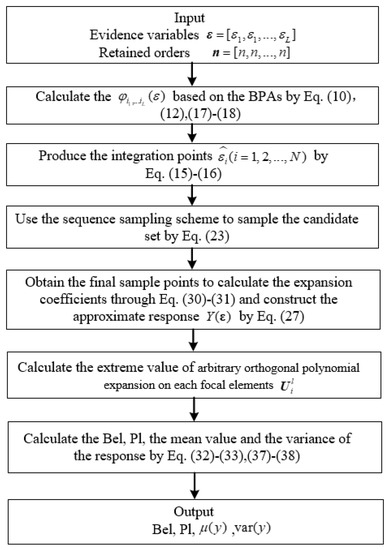 In evidence theory, the process of analysis of extreme values of each focal element represents a great computational burden, especially for multidimensional problems. In recent years, large numbers of studies have been devoted to improving the computational efficiency of extreme value analysis in the uncertainty analysis of evidence theory. The interval perturbation method is used for the extreme value analysis of each focal element [39,40,41]. Despite the fact that the interval perturbation method can receive a better computational efficiency than the Monte Carlo simulation method, with the number of focal elements increasing, the computational burden of the perturbation analysis method will inevitably increase as all joint focal-element intervals will be analyzed by interval perturbation method. Recently, the global surrogate model has been employed in evidence-theory-based uncertain analysis, which can reduce the computational cost. In the global surrogate method, the system response can be approximated by establishing a surrogate model, thus improving the computational efficiency of the extreme value analysis of all joint focal elements. Originally, the global surrogate models were applied to the evidence theory model [42,43,44]. Subsequently, Jacobi polynomial expansion was introduced to calculate acoustic system response in the context of evidence theory [45]. Additionally, the Gegenbauer series expansion method [46,47] has been applied to calculate the boundary of expectation and variance in structural acoustic problems. Wang et al. [48] combined evidence theory with the sample-based Legendre-type polynomial method to reduce the computational cost for mechanical systems. Based on the above research, the orthogonal polynomial expansion method has been applied in engineering practice to deal with uncertain analyses of evidence theory. According to the author’s research, the polynomial basis can influence the accuracy of the global surrogate model established by orthogonal polynomial expansion. The arbitrary polynomial chaos expansion method has been applied to the uncertain analysis of acoustic problems with interval and random variables [49]. Compared with the traditional orthogonal polynomial expansion method, the computational error of the arbitrary polynomial chaos method can be greatly reduced by the selection of the optimal weight function without scarifying computational efficiency [50].