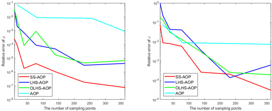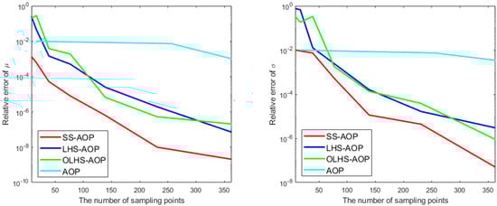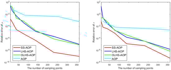 The expressions of each mathematical function are given in Table 4 and feature nonlinear characteristics. According to Equation (25), the number of sampling points used to construct the SS-AOP method is set as 8, 17, 39, 77, 139, 231, and 363, respectively. The legend of these figures is expressed as ‘surrogate model-sampling method’. In order to demonstrate the effectiveness for the multidimensional case, the number of dimensions for each case is set to 4. To simplify the problem, these variables are independent. The range of each variable xi(i = 1,2,…4) is set as .