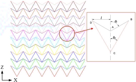 In this section, a compression process with geometric nonlinearity and the large deformation of the popular double-V NPR structure is employed to verify the effectiveness of the proposed evidence-theory-based SS-AOP method. The normalized stiffness of the NPR structure is an important index used for analyzing the structural mechanics properties in large deformation under geometric nonlinearity. Additionally, the normalized stiffness of the double-V NPR structure is greatly affected by the error of the manufacturing technique and assembly approach used. The effectiveness of the analytical solution and the FE model of normalized stiffness of a double-V NPR microstructure is shown in Ref. [61]. The schematic model of a 2D double-V NPR microstructure is shown in Figure 7.