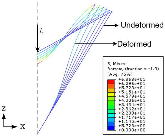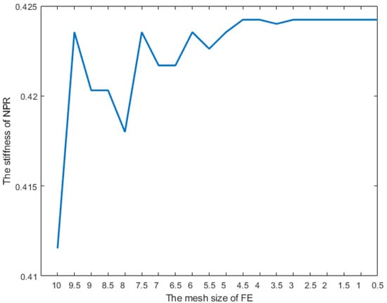 The ABAQUS software is used to simulate the large deformation and analyze the mechanical properties when the NPR structure in the compression process is geometrically nonlinear. The S-beam and L-beam are simulated as Euler–Bernoulli beams B23 because both of them are sufficiently slim. These beams are regarded as thin-walled structures and demonstrate the deformation modes of the NPR structure. Due to the constant displacement, lz = −5 mm will be set on the vertex A, and the large plastic deformation of double-V NPR is geometrically nonlinear. The compression process of the single unit cell in the z-direction is displayed in Figure 8. In this paper, due to structural symmetry, only half of the cell will be considered. The bottom node C is constrained in the z-direction. The vertex A is fixed in the x-direction and cannot rotate out of plane. The vertex B cannot rotate out of plane. These boundary conditions are equivalent to the periodic boundary condition. To illustrate the effectiveness of the mesh size, the convergence of the nonlinear analysis of double-V NPR structure is shown in Figure 9. When the mesh size is too large, the finite element simulation results will be unstable because the mesh is too large to describe the geometric features. In this paper, the double-V NPR structure was simulated when the mesh size converged.