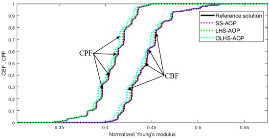 The CBF and CPF of complex structural-response analyses can be used as effective guidance for structure design and reliability-based optimization in the evidence theory model. The CBF and CPF of the normalized Young’s modulus of the double-V NPR structure model are calculated using the proposed SS-AOP method, the LHS-AOP method, and the OLHS-AOP method at the same sampling points, where the number of sampling points is 23. The reference solution is the traditional AOP with a retained expansion order of 6 for each evidence variable. The results obtained for CBF and CPF are plotted in Figure 10.