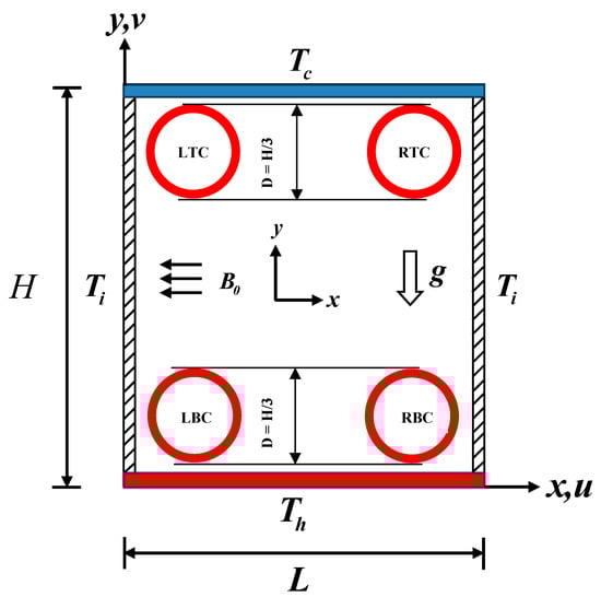 The physical configuration for the current investigation is shown in Figure 1. A steady, two-dimensional square cavity with various heated cylinders (LBC, RBC, LTC and RTC) embedded inside, along with magnetic field (B0) with the y-axis, was used in the present model. The dimension of the cavity was defined by its height (H) and length (L). The gravitational force (g) always worked in the vertically downward direction. The left and right walls of the cavity were thermally insulated (Ti). The base wall of the cavity was considered to be at a uniform hot temperature (Th) and the top wall was maintained at a cold temperature (Tc), where Th > Tc. Furthermore, a heated cylinder of a diameter D was placed in various positions within the square cavity. The diameter of the cylinder was made to be one third of the cavity’s height. The electrically conductive fluid with Pr = 0.71 [10] was placed in the square cavity and the flow of fluid was thought to be Newtonian and laminar. In addition, stable fluid properties were seen, and the boundary walls of the cavity were no-slip.