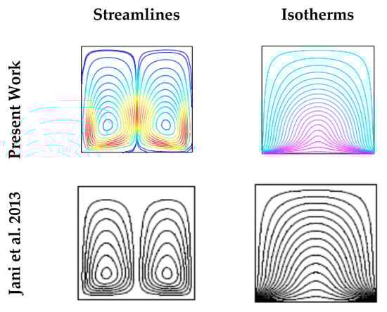 Comparison of streamlines and isotherms of by Jani et al. [10] and the present work with Pr = 0.71, Ha = 50 and Ra = 105.