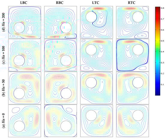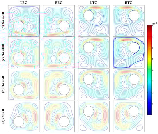 Streamlines and isotherms for assorted heated cylinder configurations along with different parameters Ha, Pr and Ra were shown in Figure 5, Figure 6, Figure 7 and Figure 8. As the beneath wall of the cavity and cylindrical block were heated, the flow of hot fluids creates eddy circulation cells, rotating along the cold walls inside the cavity from the heating wall for all parameters: Pr, Ha and Ra. To find the variations of streamlines and isotherms on various configurations of heated cylinders (LBC, RBC, LTC and RTC), a numerical study was performed with Pr = 0.71, Ha = 0–200 and Ra = 103–104, correspondingly, for flow and thermal field in Figure 5 and Figure 6. The impact of the presence of a magnetic field for streamlines and isotherms is also demonstrated in Figure 5a and Figure 6, respectively, for cavity configuration (LBC). Figure 5a shows that one eddy circulation cell formed inside the cavity. The flow strength decreases and streamlines close to the heated cylinder configurations due to the enhancement of the Hartmann number, which is shown in Figure 5b–d. The effect of the Hartmann number (Ha = 0–200) on the distributions of the velocity and temperature contours for right bottom configuration (RBC), while Ra = 103 and Pr = 0.71 is also shown in Figure 5. A tiny recirculation cell appeared in the center of the square of the cavity and the recirculation cell was smaller, owing to the increase in the Hartmann number, which is shown in Figure 5. Figure 5 also illustrates the streamlines for the left top heated cylinder configurations (LTC), along with variations of the Hartmann number (Ha = 0–200), when Ra = 103 and Pr = 0.71. Figure 5 shows in the LTC configuration that one cell was created inside the center of the square cavity in the absence of magnetic field. In addition to this, one large vortex also formed in the left bottom side of the cavity. The cell became bigger and oval shaped in the cavity with the increase of the Hartmann number and also, a tiny vortex was found in the left top side of the cavity. The variation of the Hartmann number for the right top cylindrical heat source (RTC) configuration is shown in Figure 5 for the square cavity. It can be seen that the smaller cell was formed in the square cavity due to both the absence and presence of Ha, compared with the LTC. Figure 6 shows that the isotherms for the left bottom heated cylinder configuration (LBC) are likely linear, as well as nonlinear close to the upper wall and base wall, correspondingly, with the increase in the Hartmann number when Ra = 103 and Pr = 0.71 (see Figure 6a–d). Furthermore, Figure 6a–d shows the thermal increases, owing to the increase of the magnetic field parameter: the Hartmann number (Ha). The temperature distributions for the right bottom cylindrical heat source configuration (RBC) with magnetic field’s effect on the parameter Hartmann number (Ha = 0–200) is shown in Figure 6a–d for fixed Ra = 103 and Pr = 0.71. The isotherms were parallel to the upper wall of the cavity. On the other hand, a nonlinearity effect was found near to the base wall of the cavity. The isotherms for LTC shown in Figure 6 were almost as linear as those near to the top wall. However, bend isotherms could be seen near the base wall through the effect of the Hartmann number. By increasing the Hartmann number, it could be seen that the isotherms in the RTC transform slightly in the cavity, as shown in Figure 6. When the Rayleigh number increased, that is, for higher Ra = 105, streamlines and isotherms were analyzed, as shown in Figure 7 and Figure 8 for various configurations of heated cylinders (LBC, RBC, LTC and RTC) within the square cavity for Ha = 0–200 and Pr = 0.71. As shown in Figure 7, by analyzing all configurations of the heated cylinders (LBC, RBC, LTC and RTC), it can be understood that one primary larger eddy circulation cell was created inside the cavity when Ha = 0. However, due to the increase in the Hartmann number (0 ≤ Ha ≤ 200), the velocity flow strength dwindled. Therefore, likely larger secondary recirculation cells with tiny vortices were created inside the square cavity. At higher Ra = 105–103 and when Pr = 0.71, it is shown in Figure 8 that isotherms for every arrangement of heated cylinders (LBC, RBC, LTC and RTC) looked parallel and non-parallel, respectively, near to the upper and beneath wall of the cavity for the impact of magnetic field Ha = 0–200. However, due to the increased Hartmann number and strength of flow of convection, more compacted and non-parallel isotherm lines were seen in the cavity. In addition to this, fewer bond isotherm lines were also observed near the side walls of the cavity.
