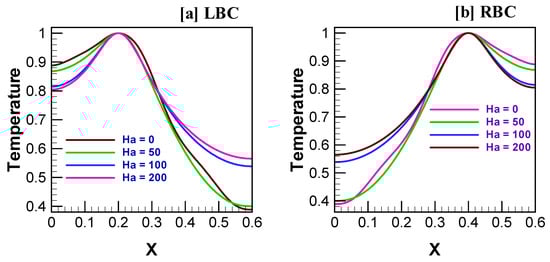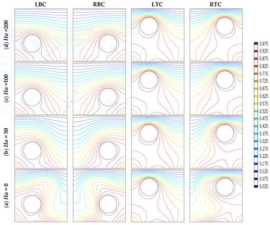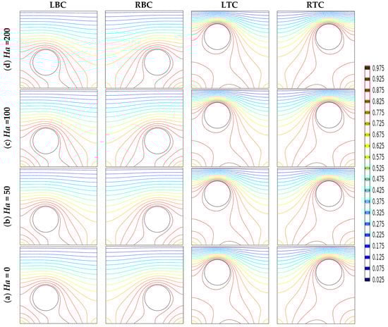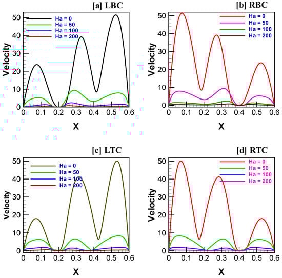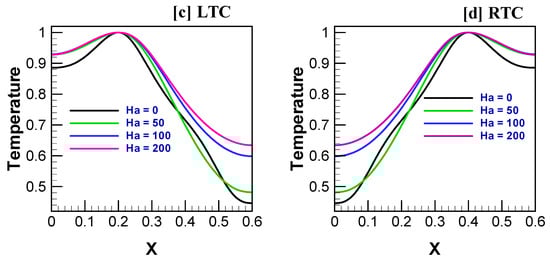 Figure 9 displays the effects of the Hartmann number (Ha) on velocity pro-files with distances for different cylinder configurations (LBC, RBC, LTC and RTC) adjacent to the line X = 0.3. As shown in Figure 9, the velocity decreased for each cylinder configuration (LBC, RBC, LTC and RTC) and with the increasing value of the Hartmann number below the central portion of the cavity. On the other hand, the velocity increased with the decrease in the Hartmann number. Due to the counterclockwise and clockwise flow directions, the maximum and minimum velocities were found in the absence of a magnetic field. The temperature fields with the distance X are plotted in Figure 10 for different cylinder heat source configurations (LBC, RBC, LTC and RTC). Figure 10 shows, for LBC, RBC, LTC and RTC, that when the Hartmann number was absent, the maximum and minimum temperatures were found in the cavity. The temperature field lessened due to the increase in the Hartmann number. For LBC and LTC, the temperature field transformed slightly with the increase in the Hartmann number to X < 0.2, but transformed significantly when the Hartmann number was X > 0.2. An inverse result was observed for RBC and RTC. It was observed that the change in the temperature field was insignificant when the Hartmann number increased to X < 0.4, but the change was significant when the Hartmann number was X > 0.4.