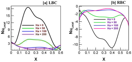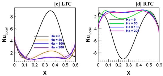 - For the LBC and LTC configurations, the local Nusselt number decreased with the increase of the Hartmann number, but for the RBC and RTC configurations, the local Nusselt number increased with the increase in the Hartmann number.