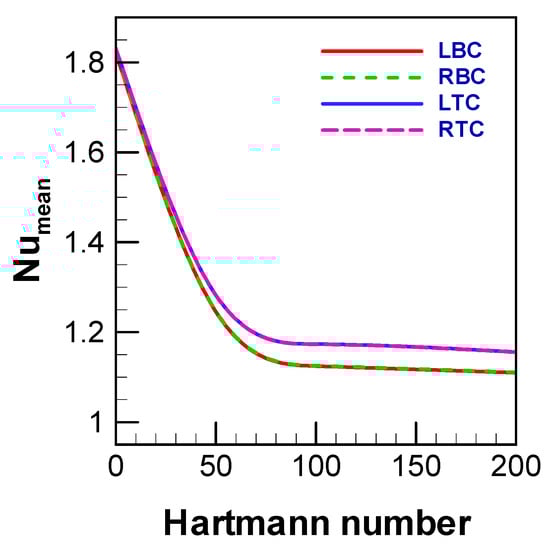 The heat transfer rates, as well as the local Nusselt number with the distance wall for different configurations (LBC, RBC, LTC and RTC) are presented in Figure 11 for the variations of the Hartmann number. Regarding the LBC and LTC configurations, Figure 11 shows that the local Nusselt number decreased with the increase in the Hartmann number, but for the RBC and RTC configurations, it was observed that the local Nusselt number increases due to the increasing Hartmann number. The heat transfer rates, as well as the mean Nusselt number for different configurations (LBC, RBC, LTC and RTC) are presented in Figure 12 against the variations of the Hartmann number. Figure 12 shows, for all configurations, that the mean Nusselt number increases due to the absence of the Hartmann number, but the mean Nusselt number decreases due to the increase in the Hartmann number.