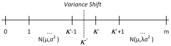 The monitoring of the variance of independent and identically distributed (i.i.d) normal random variables over time by taking successive, independent samples of measurements over time remains an interesting and valuable research consideration within quality control environment. In this case, when the variance changes to for some , the practitioner needs to investigate the scope of such a change (a value of ), and ideally, the position within the successive measurements where such a change could’ve taken place. Suppose that are i.i.d. , and i.i.d. where and , as outlined in Figure 1. The values of and are assumed to be unknown, but deterministic in nature. The order of these samples is important and cannot be re-ordered; in other words, the samples have a set sequence corresponding to the order in which they were obtained.