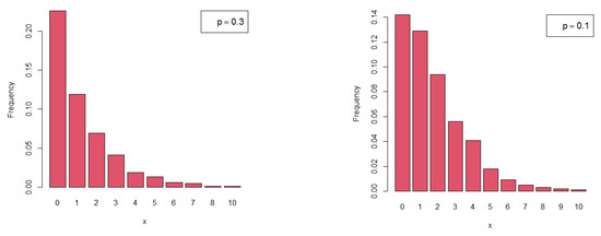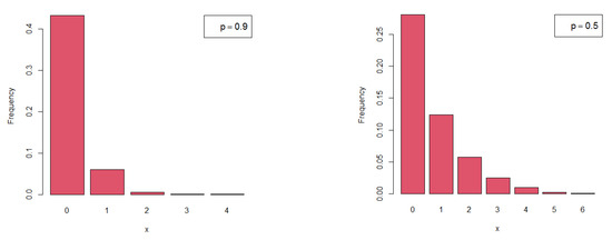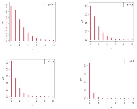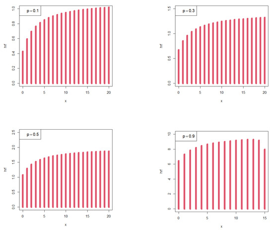 Figure 1 shows the probability mass function (pmf) plots of the proposed distribution for various values of parameter p. Thus, the pmf is always a decreasing function, and the new discrete random variable tends to take small values when p increases. The stochastic process tends to happen very quickly once the parameter value grows, which is implied quite strongly by the model’s behavior. Therefore, the BNDL model is a logical substitute for the traditional exponential distribution to characterize such phenomena. Additionally, the flexibility of the proposed BNDL can be tested for varied count data sources. For example, this model may be helpful for simulating aggregate losses that are typically limited to actuarial data by maximizing the overall garment fit for a particular number of sizes and accommodation rate, crucial to assessing the goodness of the scaling system. Furthermore, it may be helpful to overcome the problem of over-dispersed data in social sciences, as in anthropology where civilizations grew near the existence of a consistent water source, which is necessary for human survival. Figure 2 complements the results of Figure 1.