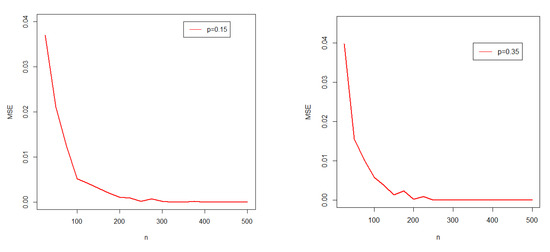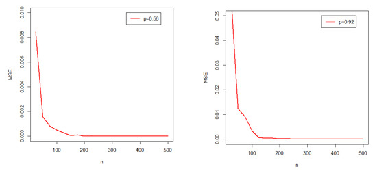 For various parameters’ values, the simulation’s results provided in Figure 6 indicate that the estimated MSEs fall off toward zero when the sample size n increases. Hence, we have conclusive evidence to claim that the maximum likelihood estimation of p satisfies the asymptotic convergence of normality. The asymptotic normality of the MLE is a very well-known classic property given as follows. In a parametric model, we say that an estimator based on is consistent if in probability as . We say that it is asymptotically normal if converges in distribution to a normal distribution. So above is consistent and asymptotically normal.