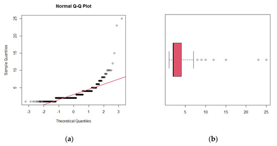 The descriptive statistics of the data sets are, Mean = 2.93, Median = 2, Mode = 3, SD = 2.02, Coefficient of Variation = 0.69, Skewness = 4.32, Kurtosis = 34.57, Range = 24, Min value = 1 and Max value = 25.
