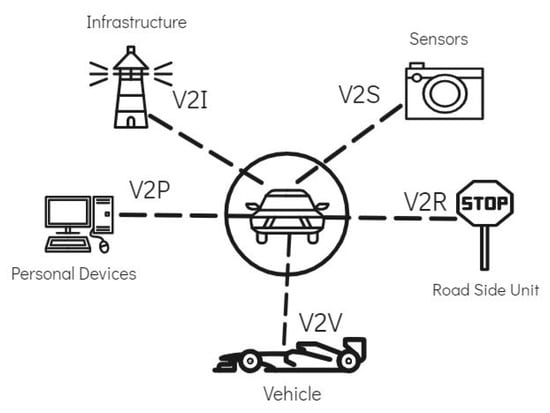 Implementing intelligent traffic management, intelligent dynamic information services, and intelligent vehicle control is one frequent application of the internet of things in the field of transportation systems []. To withstand the challenging communication environment within and/or outside the car and to provide effective and trustworthy wireless communications, the provision of vehicle-to-everything (V2X) connectivity as an alternative to more expensive radio interfaces, such as Wi-Fi, 3G/4G-TE, and DSRC/WAVE, is one way to reduce costs [].