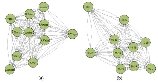 Since, in the study of centrality measures, the main goal is to study the level of transmission between different classes, the loops were eliminated from the digraphs; that is, the entries of principal diagonal of the contact matrices have been rewritten with zeros. The digraphs corresponding to contact matrices for municipalities and age groups are presented in Figure 1. The network structure conforms to the distances between the nodes (see Section 2 distance definition) in both municipalities and ages digraphs. For example, in the left digraph can be visualize an isolation of the S. Vouga municipality and in the right digraph is the 90+ age group that is isolated.