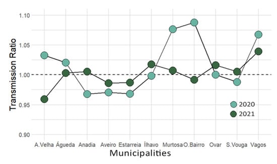 The transmission ratios for both years are shown in Figure 2, and no municipality seems to contrast with the others, being all practically similar in both years. However, A. Velha and O. Bairro, present transmission ratios with opposite signs in 2020 and 2021. It is also observed that Murtosa, O. Bairro, and Vagos are above the other municipalities in 2020.