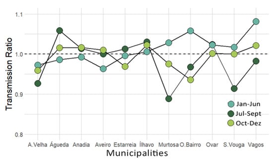 Analogously to the previous study, the transmission ratio regarding the municipality data for Jan–Jun, Jul–Sept and Oct–Dec time intervals (Figure 3), we observe low level of transmission ratios, ranging between 0.88 and 1.08. In this case, Murtosa, O. Bairro stand out from the other ones, regarding Jan–Jun vs. Jul–Sept.