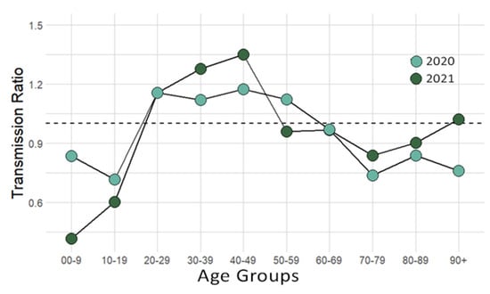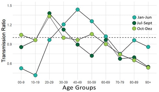 In Figure 5, we observe peaks on the transmission ratios and there is a translation of the ages that transmit the most per person and a funneling of the age range with a ratio greater than 1. The age class with the highest transmission ratio was 40–49 between Jan-Jun and between Jul–Dec was 20–29. Furthermore, the transmission ratio associated with the 70+ age classes is lower than one for the all-time periods.