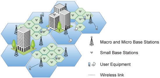 The second scenario considers a binary real-world problem from the domain of telecommunications, specifically in the context of 5G networks. A key enabling technology for these networks to meet their expected performance in terms of data rates, latency, etc. [23], lies in deploying many small base stations (SBS) close to end-users, which allows better re-use of the electromagnetic spectrum, as well as improving the signal quality and reducing the communication latency [24]. They are known as Ultra-Dense Networks (UDNs). Dimensioned to satisfy a given demand, UDNs incur considerable power consumption because of the number of SBSs that are operating. If no action is taken, this energy consumption also appears even in periods of low demand (e.g., commercial centers, office buildings, out of business hours, etc.). A well-known and standardized approach to reducing the electricity bill is to switch off a subset of the SBSs when they are underutilized. This poses a multi-objective optimization problem, named CSO (cell switch-off), which, given a set of SBSs, has to determine which subset must be turned on/off (binary decision) in order to minimize the power consumption and maximize the capacity provided to the users [25,26,27]. A detailed definition of the problem can be found in Appendix A. Recall that this is a large-scale multi-objective optimization problem, as seminal studies have anticipated that deployments with SBS every few meters might be required [24]. We have scaled up to about 12,000 cells per km in this work. Figure 1 shows an example of a UDN deployment with macro and micro base stations and small cells, where the on-off state of each one corresponds to one bit of the solutions.