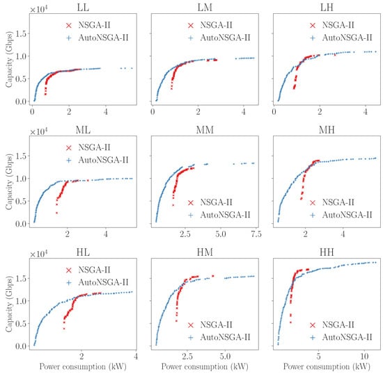 In this experimental scenario, the goal is not to reach an approximated Pareto front with a given quality level but to approximate the best possible set of non-dominated solutions. To do so, we have used nine different families of CSO instances with an increasing density, not only in the SBSs deployed in the network (i.e., the problem size) but also in the number of existing users that represents the actual demand for data traffic. Three density levels for each parameter have been considered, namely Low, Medium, and High (L, M, and H, respectively), whose full specification is included in Table A1 in the Appendix. The combination of these density levels results in nine families of instances that have already been addressed in previous works [26,27]. We would like to emphasize that we have used the term “family” because the generation of these instances involves random processes for the deployment of both users and SBSs. To address this issue, we have considered here the same 50 random seeds for the two algorithms so that both NSGA-II and AutoNSGA-II face exactly the same generated instances. Two statistical measures of the HV indicator of the approximated Pareto fronts are computed: the mean and the standard deviation (see Table 6). Finally, as we do not have the true Pareto front for this real-world problem, the stopping condition is slightly different from that of the benchmarking problems addressed in the previous section. In fact, a maximum number of function evaluations has been used, which increases with the size of the instances: 100,000, 150,000, and 250,000 for L{X}, M{X}, and H{X}, respectively, with X = {L,M,H}. To obtain a reliable value of the HV indicator, we have first composed a reference Pareto front composed of all the non-dominated solutions found by all the algorithms for each instance, and then we have normalized each approximated front prior to computing the HV value, thus avoiding the effect of the different scaling in the problem objectives.