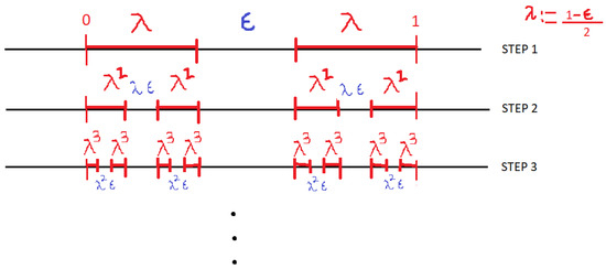(Thickness of the central Cantor sets). Given , let be the middle ε Cantor set, which is obtained by starting with the interval and then iterating the process of removing from each interval in the construction the middle open interval of a relative length ε (see Figure 3).