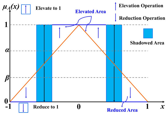 A shadowed set can be interpreted in three different ways, according to the three-way decisions. They are the positive region, characterized by the membership degree of 1, the negative zone, defined by the membership degree of 0, and the shadow zone [25]. We used a shadowed set to mimic a fuzzy set, as illustrated in Figure 1. Each of the three regions represents a change in the membership function. As a result, Pedrycz [60] proposed that the ideal pair of thresholds must meet this theory.