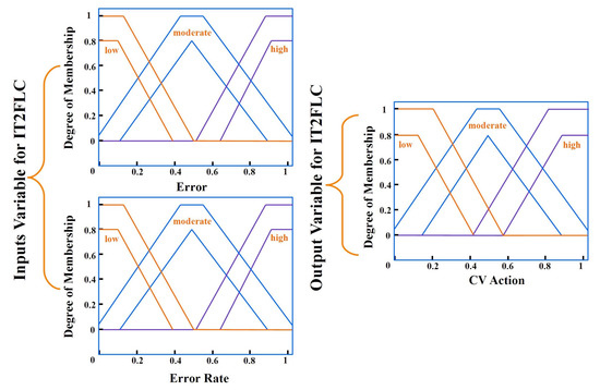 Two input variables, the error and derivative of the error, are granulated into three interval type-2 membership functions, two trapezoidal for the edges and one trapezoidal for the centre with a triangle lower membership function (LMF), labelled as “low”, “moderate”, and “high”, respectively, to construct the fuzzy controller of the TTCFNLC. The action output variables are divided into three triangle membership functions labelled “low”, “moderate”, and “high”. The inputs and outputs, making up the interval type-2 fuzzy controller of the coupled frustum tank process, granulated with triangle and trapezoidal interval type-2 membership functions, are depicted below. The type-2 membership functions are shown in Figure 5 for input and output of the IT2FLC.