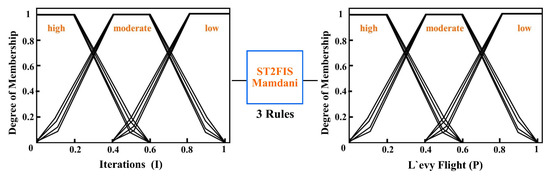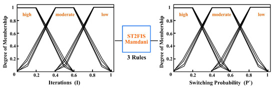 Linda and Manica proposed the use of shadowed sets in the secondary axis of the GT2 FIS in 2013 [60,63]. In this way, the optimized values of and are found and then these values are used as -planes. Hence, the computational cost is reduced, and thereafter, the implementation of GT2 FIS for dynamic parameter adaption in metaheuristic algorithms is allowed.