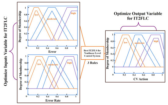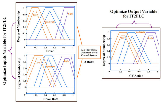 Using a metaheuristic algorithm, the methodology optimizes the membership function parameters of the interval type-2 fuzzy logic level controller (IT2FLLC) for set-point tracking (regulatory control) with negligible steady-state error. In this scenario, we measure the interval type-2 fuzzy controller’s performance and produce a result based on the established performance metric. We then continue with the optimization until a stopping criterion or a previously established number of iterations is met. Figure 6 depicts a simplified version of the process.
