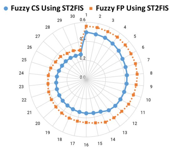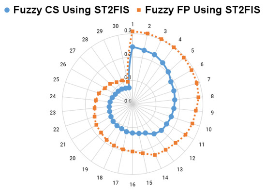 Metaheuristics have previously been used to optimize both type-1 and type-2 fuzzy systems; for example, the optimization of type-1 fuzzy controllers is discussed in refs. [27,28], which use the firefly method to optimize the fuzzy controllers of autonomous mobile robots. In Ref. [29], the flower pollination algorithm (FPA) and genetic algorithm (GA) were also used to optimize a fuzzy controller for an autonomous robot by following a trajectory, and the dynamic adaptation of its most critical parameters for the galactic swarm optimization (GSO) algorithm’s operation is described. In Ref. [29], the GSO algorithm was also used to optimize the coupled-water-tank fuzzy controller.