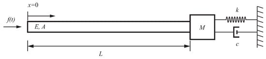 The one-dimensional elastic rod with a mass–damper–spring termination is shown in Figure 1. An impact loading is applied to its free end. Young’s modulus, the cross-section area, and the length of the rod are denoted by E, A, and L, respectively. We split total response into the sum of rigid-body and elastic responses such that