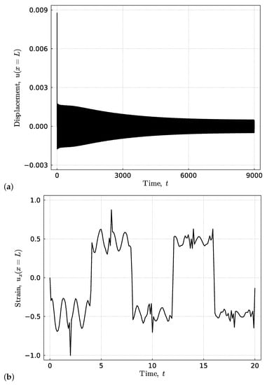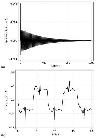 The optimal design of settling time. The corresponding (a) terminal displacement and (b) strain responses of the rod. The response is computed with .