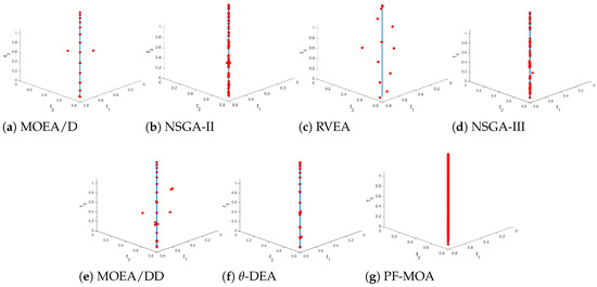In this section, numerical experiments are conducted on nine three-objective benchmark problems taken from the DTLZ test suite. To examine the efficiency of the proposed strategies, the proposed PF-MOA is compared with state-of-the-art multi-objective evolutionary algorithms, NSGA-II [9], RVEA [11], MOEA/D [10], NSGA-III [13], MOEA/DD [15] and -DEA [14]. Our code is available at https://github.com/xw00616/PF-MOA (accessed on 1 November 2022).