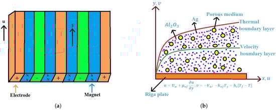 We explored the 2D Darcy–Forchheimer flow of water-based nanoparticles past a heated Riga plate. We consider that the x-axis should be aligned in the same direction as the plate, but the y-axis should be perpendicular to it. The heat equation is constructed by non-linear thermal radiation, Cattaneo–Christov theory and a non-uniform heat sink/source. Let and be the fluid temperature and free stream temperature, respectively. The bottom of the plate was heated by passing hot fluid with temperature and this generate a heat transfer coefficient . The sketch of the Riga plate and the flow model are shown in Figure 1a,b. The equations of mass, momentum, and energy with their associated constraints are shown below (e.g., Kameswaran et al. [35], Maleki et al. [36]).