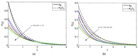 Figure 2a–d portray the outcomes of and on the nanofluid velocity profile. The results show that a larger modified Hartmann number values increases the nanofluid flow speed, whereas a larger , and result in an opposite behavior. Physically, larger values of the modified Hartmann number produce larger electrical fields, which in turn produce larger values of the wall-parallel Lorentz force experienced by the body. Since this is the case, the fluid’s speed increases. Further, the higher porosity enriches the fluid resistance during flow, which slows down fluid motion and makes the boundary layer thinner. The variations in the slip parameter and nanoparticle volume fraction on the nanofluid velocity profile are illustrated in Figure 3a,b. It is found that the increased availability of and leads to a decay in the nanofluid velocity. Physically, the fluid deforms as the velocity slip parameter increases because of the low adhesive forces.