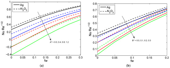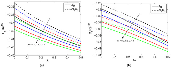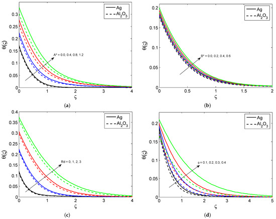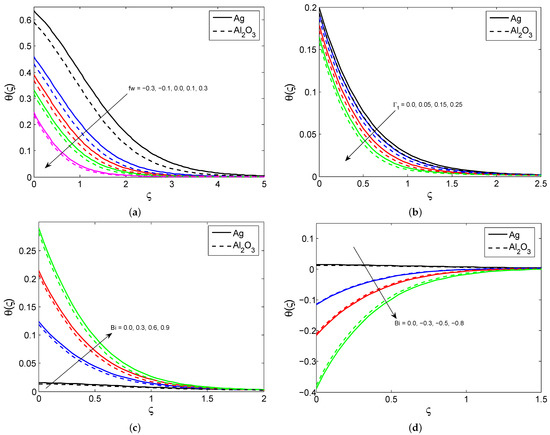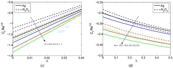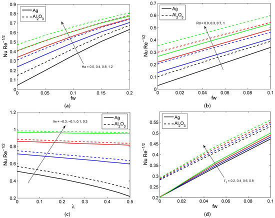 Figure 4a–d depict the transitions on the temperature distribution for various values of and . It is demonstrated that the thickness of the TBL increased due to the increased presence of , and . Physically, strengthening the thermal radiation causes increased energy transport between the particles and this causes an enrichment of the thermal boundary-layer thickness. Figure 5a–d delineates the changes in the temperature profile for disparate values of and . It is revealed that the fluid warmness declines when the values for convective cooling, injection/suction, and the thermal relaxation time parameter are enhanced, and it intensifies for larger values for the convective heating parameter. Physically, improving the convective heating parameter leads to a greater heat transfer coefficient, and this coefficient increases the fluid temperatures and thickens the thermal boundary layer. Also, Ag nanoparticles have a thicker thermal boundary layer compared to the nanoparticles. Generally, Ag nanoparticles have higher thermal conductivity than the nanoparticles. Figure 6a–d and Figure 7a–d indicate the upshot of and on the SFC. It is observed that the surface drag force decreases when increasing the , and values and it enlarges when heightening the values of and . The changes of LNN for various combinations of and are illustrated in Figure 8a–d. Based on these graphs, it can be seen that the LNN enlarges when enhancing the values of , and , and opposite reaction is observed for larger values of . Figure 9a,b shows the consequence of and on LNN. It is explored that the LNN decays when enhancing the overall quantity of and and it enriches for larger values of .