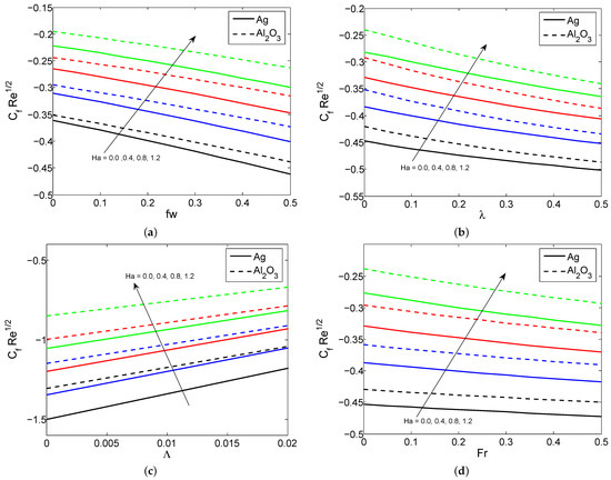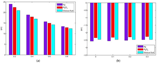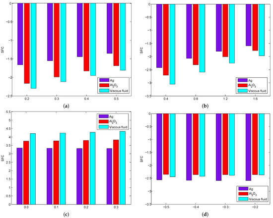 Figure 10a–d shows the slumping/growing percentage of the SFC for distinct quantities of and . In the case of the porosity parameter, the greatest diminishing percentage (2.30%) is collected in viscous fluid when is changed from 0.2 to 0.3 and the least diminishing percentage (1.35%) is obtained in Ag nanofluid when is changed from 0.5 to 0.6. In the case of , the greatest diminishing percentage (3.05%) is observed in viscous fluid when changed from 0.4 to 0.8, and the least diminishing percentage (1.59%) is observed in Ag nanofluid when is changed from 1.6 to 2. In the case of the modified Hartmann number, the greatest improving percentage (4.33%) is collected in viscous fluid when is changed from 0.3 to 0.4, and the least improving percentage (3.32%) is obtained in Ag nanofluid when is changed from 0.2 to 0.3. In the case of the injection/suction parameter, the greatest diminishing percentage (2.59%) is collected in Ag nanofluid when is changed from −0.2 to −0.1 and the least diminishing percentage (2.35%) is obtained in nanofluid when is changed from −0.5 to −0.4. Figure 11a,b shows the declining SFC percentages for a distinct quantity of and . In the case of the slip parameter, the greatest improving percentage (23.95%) is collected in Ag nanofluid when is changed from 0.2 to 0.4, and the least improving percentage (12.35%) is obtained in viscous fluid when is changed from 0.8 to 1. In the case of the injection/suction parameter, the greatest diminishing percentage (2.57%) is collected in Ag nanofluid when is changed from 0 to 0.1, and the least diminishing percentage (2.26%) is obtained in nanofluid when is changed from 0.3 to 0.4.