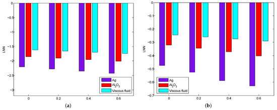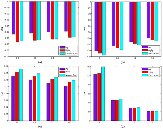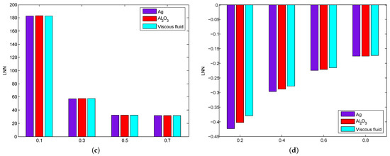 The improving/declining percentages of LNN on and are illustrated in Figure 12a–d and Figure 13a–d. In the case of the porosity parameter, the greatest diminishing percentage (0.066%) is collected in nanofluid when is changed from 0.2 to 0.3, and the least diminishing percentage (0.049%) is obtained in Ag nanofluid when is changed from 0.5 to 0.6. In the case of , the greatest diminishing percentage (0.088%) is collected in viscous fluid when is changed from 0.4 to 0.8 and the least diminishing percentage (0.060%) is observed in Ag nanofluid when is changed from 1.6 to 2. In the case of the modified Hartmann number, the greatest improving percentage (0.151%) is collected in viscous fluid when is changed from 0 to 0.1, and the least improving percentage (0.102%) is observed in Ag nanofluid when is changed from 0.3 to 0.4. In the case of non-linear radiation, the greatest improving percentage (119.56%) is collected in viscous fluid when is changed from 0 to 1, and the least improving percentage (20.76%) is observed in viscous fluid when is changed from 3 to 4. In the case of , the greatest diminishing percentage (2.433%) is collected in Ag nanofluid when is changed from 0.6 to 0.8, and the least diminishing percentage (1.619%) is observed in viscous fluid when is changed from 0 to 0.2. In the case of , the greatest diminishing percentage (0.628%) is collected in Ag nanofluid when is changed from 0.6 to 0.8, and the least diminishing percentage (0.245%) is observed in viscous fluid when is changed from 0 to 0.2. In the case of the Brinkmann number, the greatest improving percentage (183.14%) is collected in nanofluid when is changed from 0.1 to 0.3, and the least improving percentage (31.74%) is observed in Ag nanofluid when is changed from 0.7 to 1. In the case of the slip parameter, the greatest diminishing percentage (0.424%) is collected in Ag nanofluid when is changed from 0.2 to 0.4, and the least diminishing percentage (0.173%) is observed in viscous fluid when is changed from 0.8 to 1.